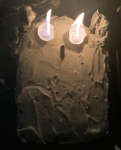 When I was a kid I had this cookbook for kids...actually, I think I left it there and had to buy a new one. It's Betty Crocker's Cook Book for Boys and Girls from 1987. Anyway, as you might know because it is still in your kitchen, there is a recipe for a Ghost Cake with Flaming Eyes: