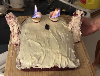 We made one a couple years ago and now I am going to make another one, but with red velvet so the ghost is red on the inside. You're supposed to use a licorice string for the mouth so the ghost is cute and smiling, but all I had were Haribo Bats, so this one is making a WoOoOoOoOoO mouth, which I think is much better for ghosts.